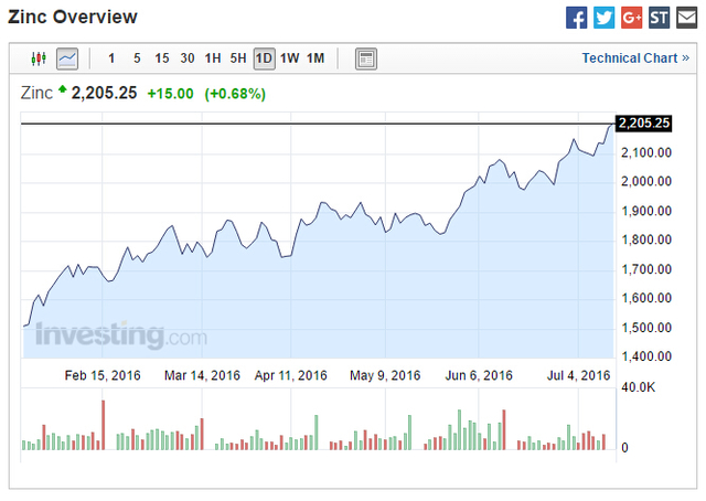 與此同時,英國和日本加碼寬松的預期推動市場風險偏好持續回升,推動LME其他金屬價格也大幅回升,其中鋅價周二漲2.5%至2193美元/噸,為去年6月1日以來新高。今年以來,隨著主要礦場的產能關閉和暫停,鋅供應也大幅縮進,價格年內大漲36%。當前鋅價漲0.68%,至2205.25美元/噸。